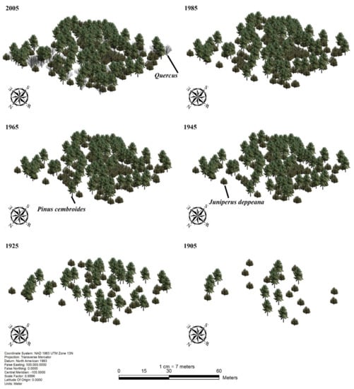 This study was conducted to provide reference conditions for restoration treatments and document long-term changes in stand structures of piñon–juniper woodlands of the Davis Mountains Sky Islands. The main objective of this study was to recreate historical stand structures by reconstructing tree temporal and spatial establishment patterns at five-points in time starting from the year 2005 to the earliest establishment date (i.e., 1985, 1965, 1945, 1925, and 1905).