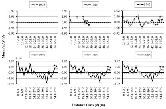 Contemporary and historical spatial autocorrelation correlograms for Mexican piñon (Pinus cembroides var. cembroides Zucc.) of study site 1. Dotted lines in the middle of each graph indicate the 0.05 significance level, and stars (★) indicate fewer than 20 neighbors for the specified distance class. The 1905 correlogram is left intentionally empty to emphasize that sampling depth did not extend into 1905.