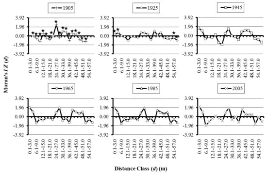 For each site, a total of 20 adjacency matrices (adjacent tree pairs represented by 1 and non-adjacent tree pairs represented by 0) were constructed. Adjacency rule differed for each adjacency matrix and was defined in 3 m distance classes [37]. Adjacent tree pairs were defined as those pairs that are 0.1–3.0, 3.1–6.0, 6.1–9.0, and 57.1–60.0 m apart (one adjacency rule for each adjacency matrix). Adjacency matrices were used as the weighting matrices in calculating Moran’s I spatial autocorrelation statistic for each distance class (d) for the variable tree age. Moran’s I values were calculated using Spatial Autocorrelation in ArcToolbox of ArcGIS 9.0 (ESRI, Redlands, CA, USA). To test the null hypothesis “the observed spatial distribution of tree ages for each d is random”, the standard normal deviate of that distance class (Z (d)) was compared to the critical standard normal deviate (−1.96 ≤ ZCritical ≤ 1.96) using an alpha level of 0.05. Correlograms were constructed by plotting the values of Z (d) on the vertical axis Y-axis) against d on the horizontal axis (X-axis) to explore the presence of even and uneven aged tree patches [37]. To identify even and uneven aged tree patches, Anselin Local Moran’s I was calculated using Cluster and Outlier Analysis in ArcToolbox of ArcGIS 9.0 (ESRI, Redlands, CA, USA).