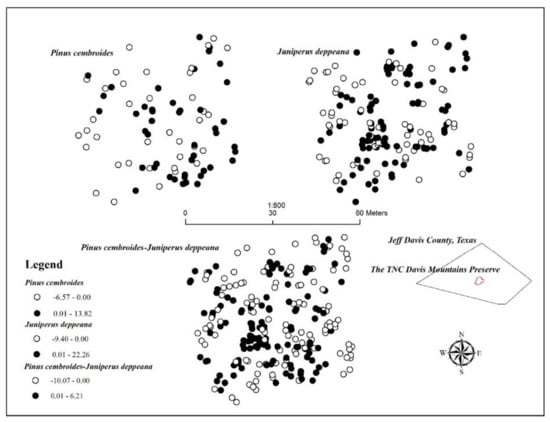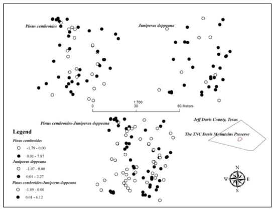 The observed spatial pattern may be confounded by the inability to capture spatial arrangement of seedlings that might have occurred in great numbers and experienced high rates of mortality and decay [5]. Temporal spatial patterns indicated that Mexican piñon and alligator juniper were equally successful in inter-canopy and open area establishment as well as establishment within existent clusters, in contrast to Everett et al. [41] who found that piñon seedlings were more abundant under tree canopies than in inter-canopy spaces in Utah. In the Davis Mountains, however, summer monsoons may have lessened the need for nurse-tree micro-environments that are necessary for establishment and survival in the Great Basin [38]. In addition, differences among species (Mexican piñon and alligator juniper versus piñon pine and Utah juniper) in terms of light, moisture, competition tolerance, and nutrient levels needed for germination and seedling survival and development may have attributed to the observed differences. Climate change would certainly impact these development patterns, and under future climate projections, nurse-tree micro-environments may become more important for establishment and survival of piñon and juniper in the Davis Mountains [17,18,19].