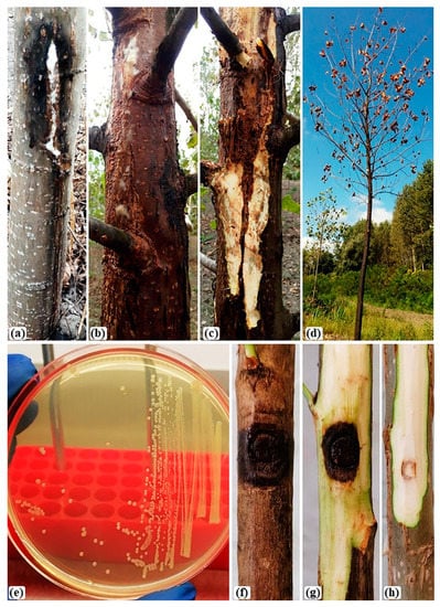 - Berruete, I.M.; Cambra, M.A.; Collados, R.; Monterde, A.; López, M.M.; Cubero, J.; Palacio-Bielsa, A. First report of bark canker disease of poplar caused by Lonsdalea quercina subp. populi in Spain. Plant Dis. 2016, 100, 2159. [Google Scholar] [CrossRef]