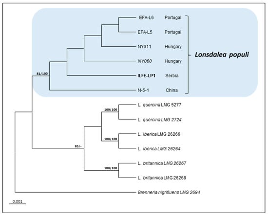 Maximum-likelihood (ML) tree resulting from ML analyses of the concatenated atpD, gyrB and infB gene sequences and showing the phylogenetic position of Lonsdalea populi in relation to its closely related species. The bootstrap support values (ML/MP ≥ 80% (maximum parsimony: MP)) are indicated at the nodes, and the scale bar represents the expected number of changes per site. The tree was rooted to Brenneria nigrifluens. Strain ILFE-LP1 identified in this study is shown in bold and a clade corresponding to L. populi is highlighted.