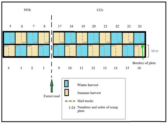 A total of 24 square survey plots were established, with side length 50 m and area 0.25 ha. The survey plots were numbered according to the order in which work was performed within them. The limits of the working plots were marked on trees which were not a part of the study area. A skid trail was designated on each plot, running through the middle and along the border (Figure 1). The distance between the skid trails was 25 m.