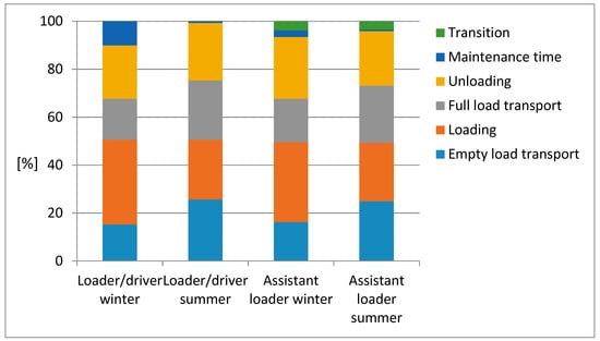 The percentage shares of the particular tasks accounting for the overall timber harvesting process defined for the studied jobs (logger, assistant logger, loader/tractor driver, assistant loader) are presented in Figure 2 and Figure 3.