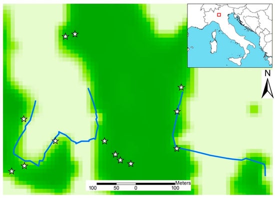 The present study was conducted in the “Bosco delle Colombere” (Colombere wood) natural reserve, a small private forested area of approximately 20 ha located inside the Monte Netto Regional Park (coordinates: 45°26′54.95″ N, 10°8′56.84″ E; Figure 1).