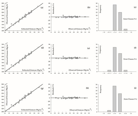 Dispersion of estimated value by observed value, dispersion of residues, and distribution in error classes obtained for the biomass adjustments (Mg ha−1) using non-linear models, where (a–c) refer to the Richards model, (d–f) to the Weibull model, and (g–i) to the Schumacher–Hall model.