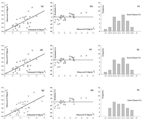 Dispersion of estimated value by observed value, dispersion of residues, and distribution in error classes obtained for the nitrogen adjustments (Mg ha−1) using non-linear models, where (a–c) refer to the Richards model, (d–f) to the Weibull model, and (g–i) to the Schumacher–Hall model.