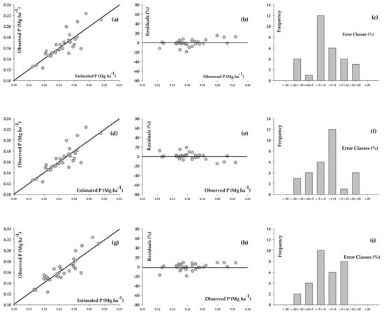 Dispersion of estimated value by observed value, dispersion of residues, and distribution in error classes obtained for the phosphorus adjustments (mg ha−1) using non-linear models, where (a–c) refer to the Richards model, (d–f) to the Weibull model, and (g–i) to the Schumacher–Hall model.