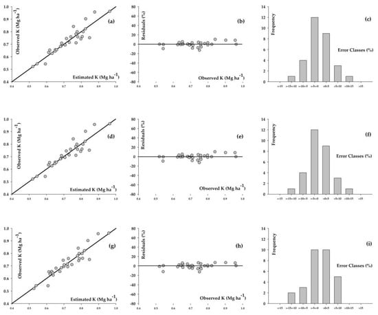 Dispersion of estimated value by observed value, dispersion of residues, and distribution in error classes obtained for potassium adjustments (Mg ha−1) using non-linear models, where (a–c) refer to the Richards model, (d–f) to the Weibull model, and (g–i) to the Schumacher–Hall model.