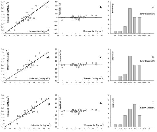 Dispersion of estimated value by observed value, dispersion of residues, and distribution in error classes obtained for the calcium adjustments (Mg ha−1) using non-linear models, where (a–c) refer to the Richards model, (d–f) to the Weibull model, and (g–i) to the Schumacher–Hall model.