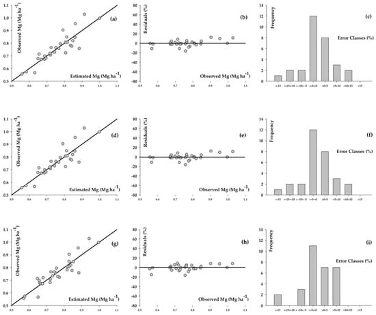 Dispersion of estimated value by observed value, dispersion of residues, and distribution in error classes obtained for the magnesium adjustments (Mg ha−1) using non-linear models, where (a–c) refer to the Richards model, (d–f) to the Weibull model, and (g–i) to the Schumacher–Hall model.