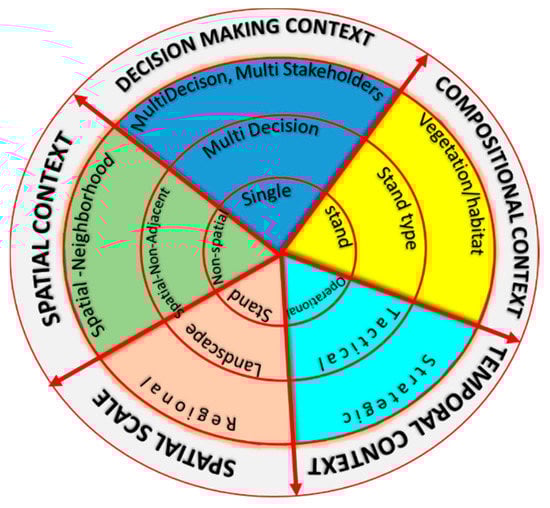 Forest ecosystems are naturally developed and organized in a hierarchical structure with larger units at a broader scale (i.e., age class distribution, forest type classification) encapsulating the smaller units (i.e., vegetation types, stands, group of trees) at a finer scale. Similarly, decision problems at each organizational or classification level in forest management planning differ in time horizon, management level, spatial coverage, source and detail of information, and the risk and uncertainty associated with the outcome [43]. Managing all forest ecosystem features in a holistic approach may need to address issues at various organizational scales in a management hierarchy. Thus, the decision-making process involved in planning often encompasses a management hierarchy, ranging from strategic level decisions to operational level decisions.