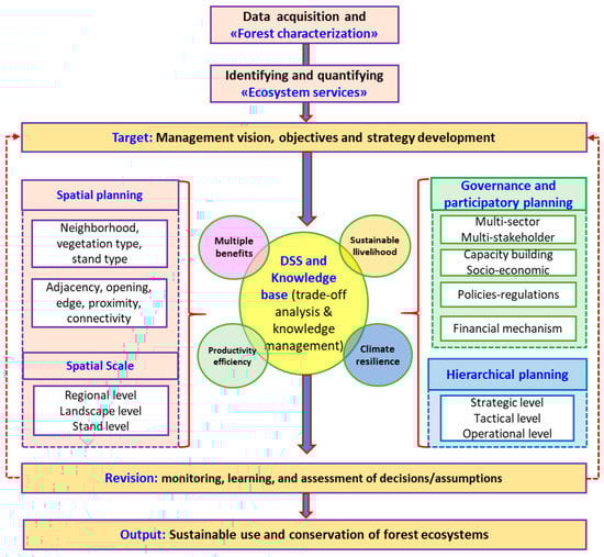 The main components of the planning process were identified and described on the basis of the framework’s principle dimensions. The research highlighted the need of a landscape-level perspective and of spatial resolution to integrate multiple ecosystem services, embracing the complexity of multi-stakeholder and scale issues. It strives for the heterogeneous matrix of landscape and multi-functionality with a few values operating at a range of different spatial and temporal scales, deliberately engaging the social system with the natural system through various stakeholder participation forms in decision-making. Spatial resolution is critical in developing on-the-ground plans as many ecosystem services connote spatial features and require an accurate spatial representation of objects. Methods and tools are the key components to help choose appropriate planning options and support the involvement of stakeholders and public participation in hierarchical planning processes to prepare an efficient plan. They enable the test of theoretical visions or hypotheses before implementing them on the ground and understand future forest dynamics by virtually exercising various planning options. They encapsulate the ecological–economic–social complexity of forest ecosystem management, information about trade-offs between ecosystem services, as well as the sensitivity of the plan to uncertain parameters in a timely manner. Critical aspects of a comprehensive DSS include generality, user-friendliness, transparency, simplification, abstraction, and functionality, besides considering the spatial features of planning problem. It is then only possible to realize an adoptive management approach through circular linking of the theoretical thoughts to the results of management interventions in reality on the ground through decision-making tools.