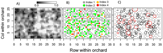 Within the orchard, spatial variation in (A) relative photosynthetic photon flux density. (B) Fruiting index of each tree. Index 1: trees that did not produce female cones, index 2: trees with female cones that were very sparsely distributed within the crown, index 3: trees with female cones that were sparsely distributed within the crown, or trees produced numerous female cones on a few branches only and index 4: trees that produced female cones abundantly on several branches. (C) Number of female cones produced per tree. Red circles indicate girdled trees and black circles indicate intact trees.