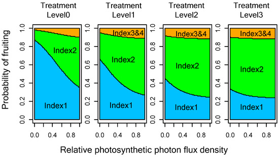 The probability of female cone production varied markedly in response to light intensity (rPPFD) across different girdling treatments (Figure 2, Table 1). In girdling level 0 (i.e., intact stems), the probability of producing female cones (green: index 2 and orange: indices 3 and 4) increased markedly with increasing light intensity. In the situation where rPPFD was greater than approximately 0.5 (i.e., 50% sunlight), the probability of producing female cones (green and orange) was larger than that of not producing cones (blue: index 1). Two out of 12 trees in girdling level 3 died, but none of the trees in girdling levels 0–2 died.