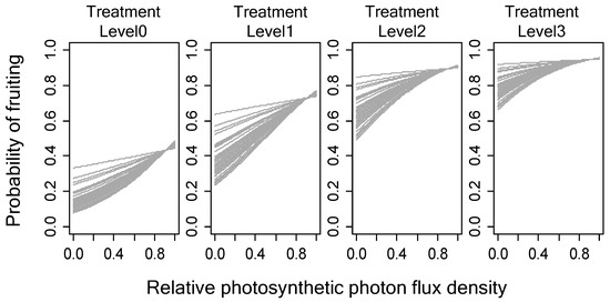 Genotype-specific relationship between fruiting probability and light intensity (relative photosynthetic photon flux density) across different girdling treatment levels. Each gray line indicates each L. kaempferi genotype (clone).