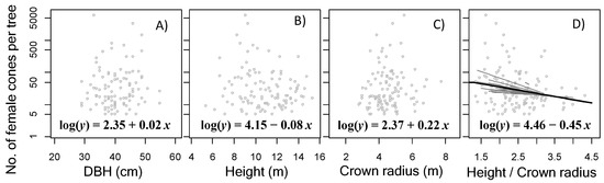 When examining the relationships between female cone production and traits of the trees (size and shape), a significant negative relationship was observed between female cone production and the height/crown radius ratio (p < 0.05; bold black line in Figure 4D), and smaller trees with a relatively wider crown radius tended to produce more female cones. No significant relationships were observed between female cone production and the other traits (Figure 4A–C).