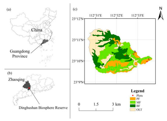 Location of the experimental sites in Dinghushan Biosphere Reserve (c), Zhaoqing (b), Guangdong, China (a). Abbreviations: OLT, other land-use types; PF, Pinus massoniana forest; MF, mixed Pinus massoniana/broad-leaved forest; BF, monsoon evergreen broad-leaved forest.