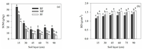 Soil organic matter (a) and bulk density (b) of the 0–90 cm soil layer of different forests. Values are the means ± SE. Lowercase letters above the columns represent statistically significant differences among stand types for the same soil layer (Duncan’s test, p < 0.05). Abbreviations: SOM, soil organic matter; BD, bulk density; PF, Pinus massoniana forest; MF, mixed Pinus massoniana/broad-leaved forest; BF, monsoon evergreen broad-leaved forest.