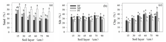 As shown in Figure 3, there was no significant difference in all levels of particles among the soil layers in PF. When averaged across the 0–90 cm depth, the proportion of sand was significantly higher (50.3%), and the silt and clay contents were significantly lower (26.4% and 23.3%, respectively) in PF than in the other forests. The sand content of MF decreased from 48.4% to 27.7% as soil depth increased, which was significantly lower than that of PF. The average silt content of MF (28.0%) was similar to that of PF for the 0–90 cm depth. The change trend of the clay content of MF in the vertical section was opposite to that of the sand content, with a mean value of 35.6%, similar to BF (34.4%). When averaged across the 0–90 cm depth, the sand content of BF (30.6%) was significantly lower than that of other forests, and the total proportion of the silt and clay was 69.4%.