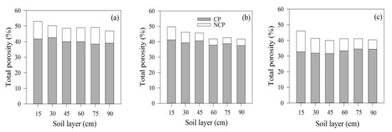 The CP was the main component of soil porosity in the three forests. The average CP/TP values were 0.82, 0.88, and 0.80 in BF, MF, and PF, respectively. The CP of all soil layers in PF was significantly lower than that in the other forests, and the corresponding values of BF and MF were similar. In general, the CP of BF and MF tended to decrease as the soil depth increased, and the CP of the 15–30 cm soil layer in BF was the highest (42.6%). When averaged across the 0–90 cm depth, the CP values were ranked as BF (40.3%) > MF (39.3%) > PF (33.0%). The mean NCP of MF (5.4%) was the lowest among the forests at the 0–90 cm depth, while the mean NCP of PF (8.6%) was close to that of BF (9.2%).