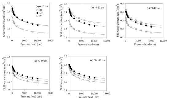 SWRC (θ-h relationships) was determined at pressure heads from 102 to 10,200 cm H2O. The measured data were well fitted by the VG model, which had high determination efficiencies of more than 99%. The data in Figure 5 show that BF and MF had significantly larger moisture retention capacities of soil at any given pressure head compared to PF, especially at the 0–40 cm depth. There was no significant difference in the water-holding capacity between forests at the 40–100 cm depth.