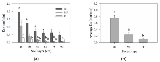 Distribution of KS along the soil profile (a) and the differences in average KS in the different forests (b) in Dinghushan. Values are the means ± SE. Lowercase letters above the columns represent statistically significant differences among stand types (Duncan’s test, p < 0.05). Abbreviations: KS, saturated hydraulic conductivity; PF, Pinus massoniana forest; MF, mixed Pinus massoniana/broad-leaved forest; BF, monsoon evergreen broad-leaved forest.