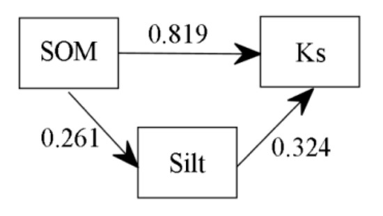 This indicated that SOM and silt contents were the main drivers of KS in this study area. To determine the direct and indirect effects of the above two soil properties on KS, the path analysis method was further used for analysis. The residual path coefficient was 0.28, and the Durbin Watson statistic was 1.16, indicating that the result of path analysis was reliable. As shown in Figure 7, the direct path coefficient of SOM (0.82) for KS was greater than that of the silt content (0.32), while the indirect path coefficient of SOM for KS based on the silt content was 0.08.