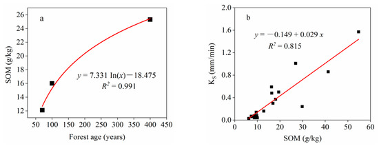 The improvement of the KS reduced surface runoff and erosion, thus effectively replenishing soil moisture and groundwater resources [3,6]. It could be seen from Figure 8 that the accumulation rate of SOM was fast before the middle recovery stage and then slowed down. The KS increased with the increase in SOM, and the relationship of them could be fitted by a linear function (, R2 = 0.815). We could predict that the regional eco-hydrological benefits will gradually improve with the maturation of the stands planted in Guangdong in 1980s, which is of positive significance for the response to the extreme precipitation pattern in the future [21].