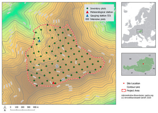 LTER Zöbelboden has a size of 90 ha and is situated in the northern part of the national park “Northern Limestone Alps”, approximately 50 km south of Linz (N 47°50′30″, E 14°26′30″) (https://deims.org/8eda49e9-1f4e-4f3e-b58e-e0bb25dc32a6) (Figure 1). The altitude ranges from 550 m to 956 m a.s.l. The main rock type is Norian dolomite (Hauptdolomit), which is partly overlain by limestone (Plattenkalk). Due to the dominating dolomite, the watershed is not as heavily karstified as limestone karst systems but shows typical karst features, such as conduits and sinkholes. These conduits and sinkholes provide pathways for rapid water flow and quick response times to water input at the soil-bedrock interface. The long-term average annual temperature is 7.2 °C. The coldest monthly temperature at 900 m a.s.l. is −1 °C in January, the highest is 15.5 °C in August. Annual rainfall ranges from 1500 to 1800 mm. Monthly precipitation ranges from 75 mm (February) to 182 mm (July). Snowfall occurs between October and May with an average duration of snow cover of about 4 months. From the start of the project in 1992 onwards, forest management has been restricted to single tree harvesting just in case of bark beetle infestation. Wind throw is frequent in the area with single tree events and events affecting larger areas.