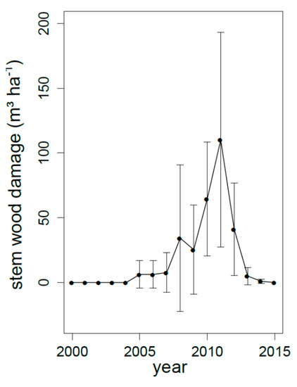 Wind throw and bark beetle disturbances started in 2006 with the damages caused by the storm Kyrill followed by two other storms in 2008. The subsequent spruce bark beetle outbreak peaked in the year 2011 (Figure 2). At Zöbelboden, these disturbances mostly damaged single trees and groups of trees while stand replacement of larger areas (>0.5 ha) only occurred in 5% to 10% of the catchment.