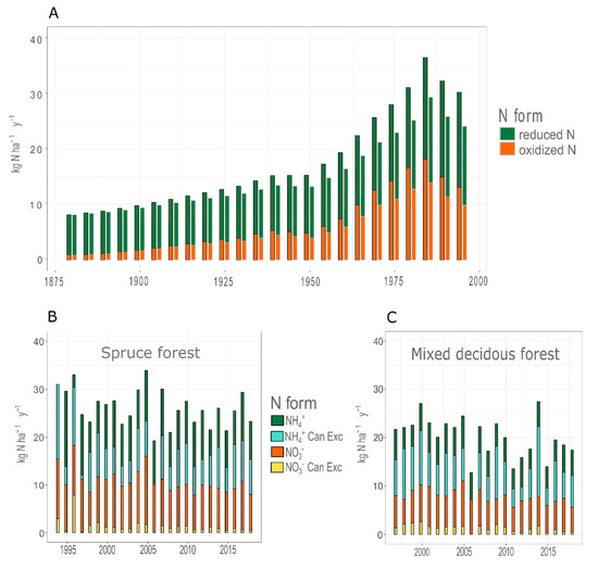 Based on a reconstruction, total inorganic N deposition before 1900 was below 10 kg N ha−1 y−1 in the study area. Annual N deposition peaked in 1980 to approx. 30 to 35 kg N ha−1 y−1 and thereafter only slowly decreased to the current levels (Figure 4A).
