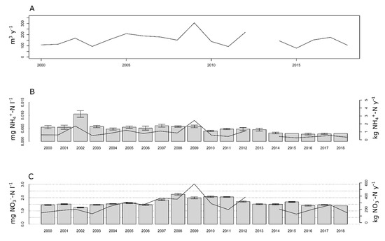 The mean annual NH4+-N concentrations were 0.005 ± 0.002 mg L−1 with the highest values in 2002 (0.011 mg L−1) and the lowest in the last years from 2015 to 2018 (0.003 mg L−1). These concentrations total to an annual NH4+-N runoff of 0.8 ± 0.6 kg at the gauging station (Figure 5B). The annual discharge of NH4+-N from the catchment was 0.014 ± 0.91 kg ha−1 y−1.