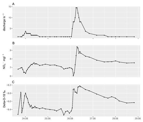 (A) Discharge, (B) NO3− concentrations, and (C) δ 18O at the gauging station 551 during a rainfall event in the year 2012.