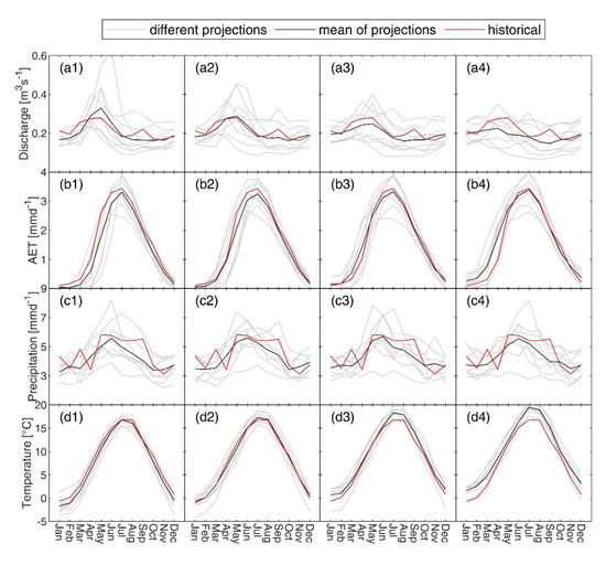 Comparisons between historical and projected mean monthly (a) discharge, (b) actual evapotranspiration, (c) precipitation, and (d) temperature, where the number 1–4 represent the four projected time periods: 2021–2040, 2041–2060, 2061–2080, and 2081–2100, respectively. The red line shows the historical simulations (discharge, AET) or observations (precipitation, temperature) for 1994–2019. The black line indicates the mean of the simulations obtained from the eight climate projections while the grey lines represent the results from the individual climate projections.