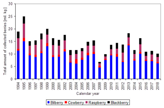 The total amount of the collected forest berries (bilberries, cowberries, raspberries and blackberries) in the Czech Republic (CZ) (millions of kg) in the period 1994–2018 (Sisak et al. 2016 [43], extended).
