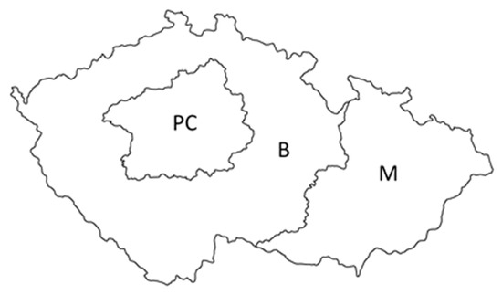 Regions in the Czech Republic. PC—Prague and Central Bohemia, B—Bohemia without the central region, M—Moravia.