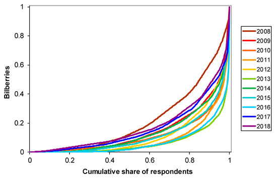 A more detailed analysis of the distribution of these inequalities in the bilberry harvest is provided by the Lorenz curve (2). The cumulative volume of the collected amount of bilberries each year for the period of 2008–2018 is placed on the y axis (first ordered in ascending order) and the cumulative percentage of the respondents is placed on the x axis.