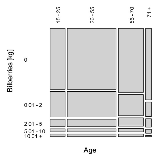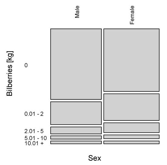 The first analysed contingency table is constructed by using the categorical variable of the respondent’s gender and the categorical variable of the amount of bilberries collected. Using a mosaic display (see Figure 4), it can be seen that the proportion of men not collecting bilberries (category 0 on the y axis) is much higher than in the case of women. The significance of the differences can be evaluated by Fisher’s exact test [49]. In this case, the resulting p-value of 0.0005 indicates highly significant differences.