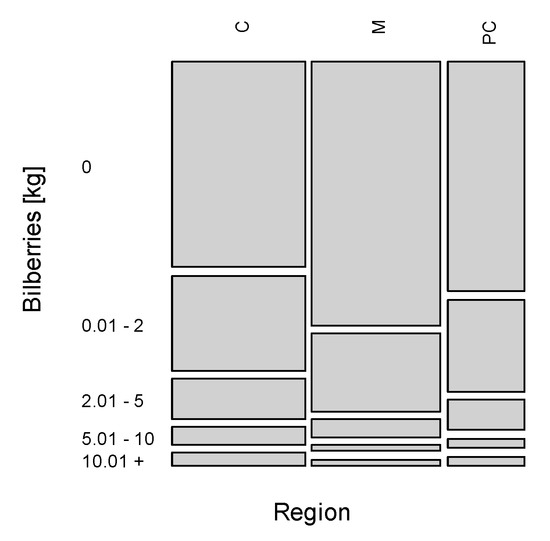 Figure 6 shows that the category of non-pickers (category 0 on the y axis) is lower in villages and small towns (up to 4999 inhabitants). However, the category of non-pickers has a surprisingly lower representation in cities over 100,000 inhabitants, whose residents are more likely to compensate for a city life by spending their free time outdoors and on holiday. City dwellers often own weekend houses and cottages in the countryside, which they often commute to. Czech people are “cottage people”; there are 287,000 cottages in the country, and it is said that every fifth Czech house is used for recreational purposes. Only more cottages per inhabitants can be found in Sweden [77]. Cottages are a part of the so-called second housing, which also is included in the work of [78] and [79]. The outdoor stay of these people is often accompanied by a forest visit and “recreational” forest berry collection. These results are consistent with Šišák [41], [80]. Accordingly, Figure 7, where the size of the collection is analysed compared to the three regions: PC (the capital Prague and Central Bohemia), B (the rest of Bohemia), M (Moravia). Again, it is obvious that the Central Bohemia area, with a large number of recreational facilities and large cities, where the inhabitants of Prague are a significant portion of the visitors, which lies in the centre of this area, shows a higher collection intensity than, e.g., Moravia. In the case of Central Bohemia, the number of forest visitors is so high (mostly because of the visitors from Prague, who leave the area of the capital city to go into “nature”) that the volume of forest fruit harvesting approaches the limits of the forest production possibilities.