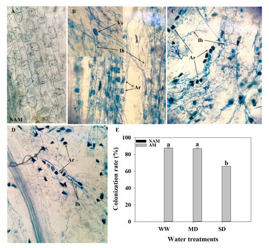 Development of arbuscular mycorrhizal fungus (AMF) Rhizophagus intraradices in Catalpa bungei seedling roots by Trypan blue staining. (A) The root of a non-inoculated plant. (B) Inoculated roots under well-watered (WW), (C) moderate drought (MD), and (D) severe drought (SD) conditions. (E) Colonization rate of mycorrhizal C. bungei seedlings. Ih, intraradical hyphae; Ar, arbuscule; Vs, vesicles; (A, B, C and D, G: ×400). NAM, non-AMF-inoculated; AM, AMF-inoculated. Different lowercase letters above the bars indicate significant differences (p < 0.05) among treatments. Values are means ± SE (n = 3).