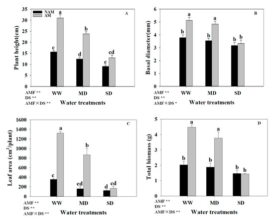 Effect of arbuscular mycorrhizal fungus (AMF) Rhizophagus intraradices on (A) plant height, (B) basal diameter, (C) leaf area and (D) total biomass of Catalpa bungei seedlings under DS. NAM, non-AMF-inoculated; AM, AMF-inoculated; WW, well-watered; MD, moderate drought; SD, severe drought; DS, drought stress. Different lowercase letters above the bars indicate significant differences (p < 0.05) among treatments. Values are means ± SE. Plant heights and basal diameters are based on 9 biological replicates, while leaf area and total biomass represents the average of three biological replicates. Two-way ANOVA output: ns, not significant; * p < 0.05; ** p < 0.01.