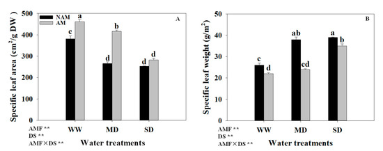 Effect of the arbuscular mycorrhizal fungus (AMF) Rhizophagus intraradices on (A) specific leaf area (SLA) and (B) specific leaf weight (SLW) of Catalpa bungei seedlings under DS. NAM, non-AMF-inoculated; AM, AMF-inoculated; WW, well-watered; MD, moderate drought; SD, severe drought; DS, drought stress. Different lowercase letters above the bars indicate significant differences (p < 0.05) among treatments. Values are means ± SE (n = 3). Two-way ANOVA output: ns, not significant; ** p < 0.01.
