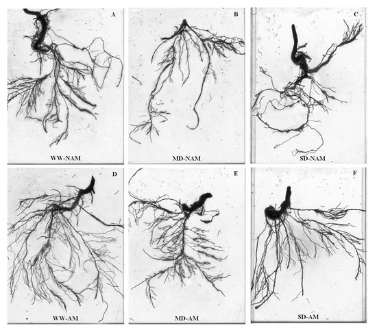 Effect of the arbuscular mycorrhizal fungus (AMF) Rhizophagus intraradices on the root morphology of Catalpa bungei seedlings under drought stress. (A), WW-NAM; (B), MD-NAM; (C), SD-NAM; (D), WW-AM; (E), MD-AM; (F), SD-AM; NAM, non-AMF-inoculated; AM, AMF-inoculated; WW, well-watered; MD, moderate drought; SD, severe drought.
