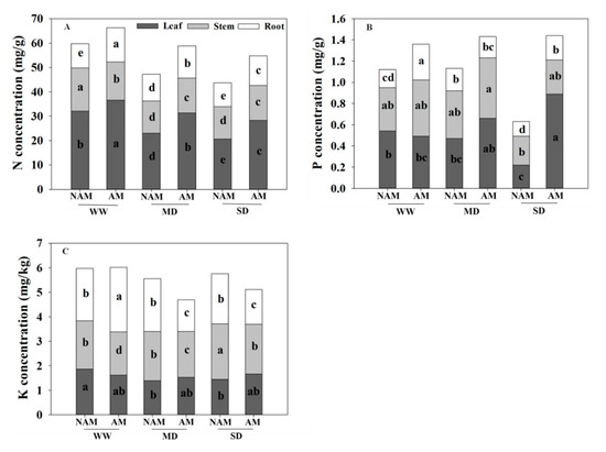 Effect of the arbuscular mycorrhizal fungus (AMF) Rhizophagus intraradices on the (A) nitrogen (N), (B) phosphorus (P) and (C) potassium (K) concentrations in Catalpa bungei seedlings under drought stress. NAM, non-AMF-inoculated; AM, AMF-inoculated; WW, well-watered; MD, moderate drought; SD, severe drought. Different lowercase letters above the bars indicate significant differences (p < 0.05) among treatments. Values are means ± SE (n = 3).