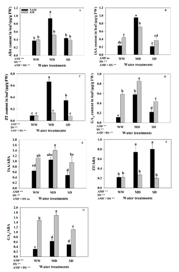 - Wang, W.X.; Zhang, F.; Chen, Z.L.; Liu, J.; Guo, C.; He, J.D.; Zou, Y.N.; Wu, Q.S. Responses of phytohormones and gas exchange to mycorrhizal colonization in trifoliate orange subjected to drought stress. Arch. Agron. Soil Sci. 2017, 63, 14–23. [Google Scholar] [CrossRef]