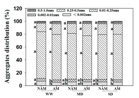 Effect of the arbuscular mycorrhizal fungus (AMF) Rhizophagus intraradices on the distribution of soil aggregates under drought stress. NAM, non-AMF-inoculated; AM, AMF-inoculated; WW, well-watered; MD, moderate drought; SD, severe drought. Different lowercase letters above the bars indicate significant differences (p < 0.05) among treatments. Values are means ± SE (n = 5).