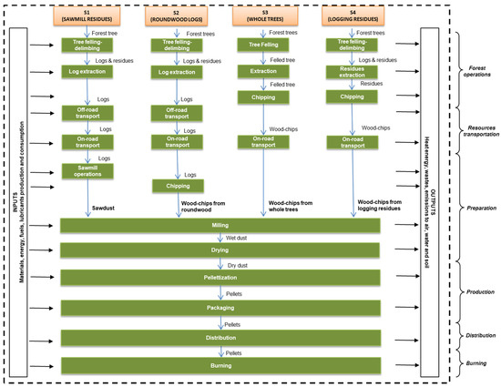 As shown in Figure 1, four different pellet supply chains were compared in the assessment. System 1 (S1) uses sawmill residues (sawdust, shavings, trims, and bark) as raw material to produce pellets, while system 2 (S2) uses roundwood logs. These two systems are the most common pellet supply chains in Europe. Another two options were investigated: system 3 (S3), which uses the standing softwood tree components (stem, branches, and needles) after thinning operations, and system 4 (S4), which is based on the use of logging residues.