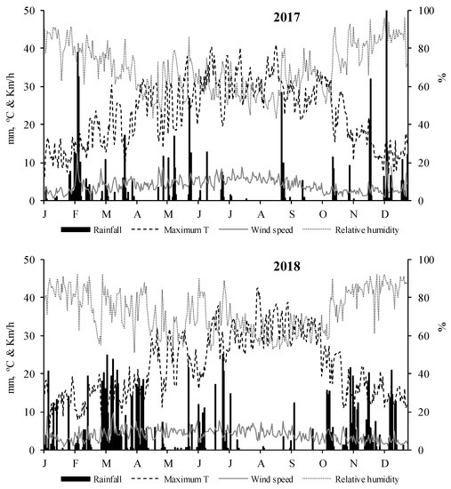 Meteorological variables: Maximum Temperature (black lines), Rainfall (black bars), Relative humidity (grey lines) and Wind speed (grey lines).