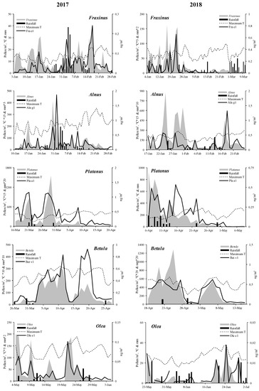 Pollen grain concentrations (grey area), allergen concentrations (black line), maximum temperature (points line) and rainfall (bar) for Alnus, Betula, Fraxinus, Olea and Platanus during the MPS.